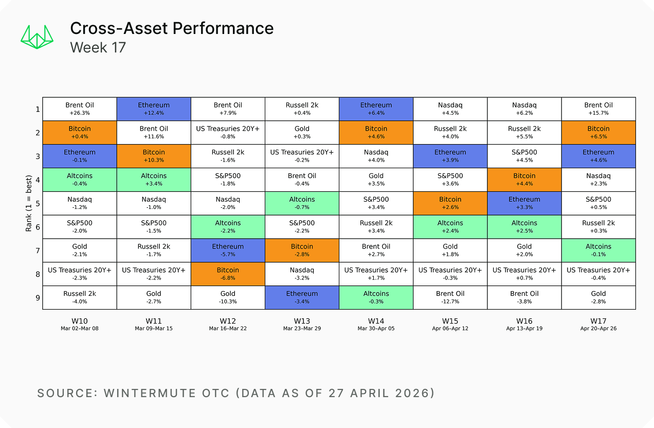Ở phía altcoins, correlation giữa top 10 tới top 250 tokens lại bắt đầu phân kỳ. Hiệu suất tổng thể khá phẳng nhưng những tên idiosyncratic bắt đầu được bid. Privacy tokens vẫn đang dẫn, DeFi có phần lẫn lộn hơn kỳ vọng mặc dù có vụ Kelp hack, L1s phân tán hơn thay vì tụ tập chặt như trước. Đây là môi trường mà nghiên cứu sâu bắt đầu trả cổ tức.